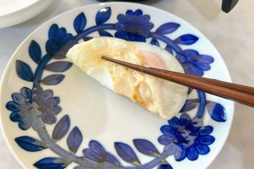 フタを開けると、周りがくっつかない程度に火が通っています。裏返して1分10秒、反対の面も焼いていきます。(熱いので裏返す時は注意!小さめのヘラみたいなのがあると裏返しやすい)