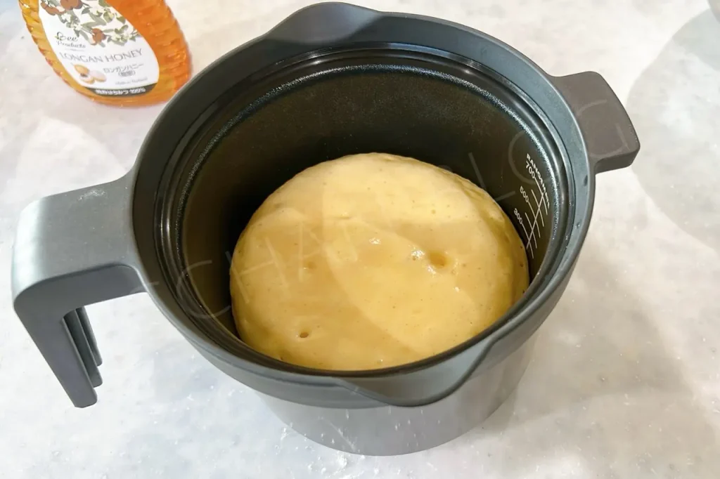 レシピは2枚分焼けるので、温めたマグポットに半分の生地を流し込み、フタをして600Wで2分20秒(電子レンジのパワーが弱めなので20秒プラス)。